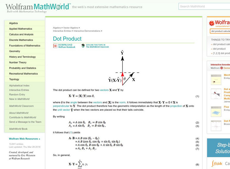 This math site gives the formula for taking the dot product of two vectors, gives properties of dot products, (commutative, associative, and distributive), how to find the derivative of a dot product. This site has links to several other...