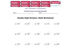 For this division worksheet, students practice dividing 20 double digit whole number division math problems. Students write their answers on the worksheet underneath each problem.
