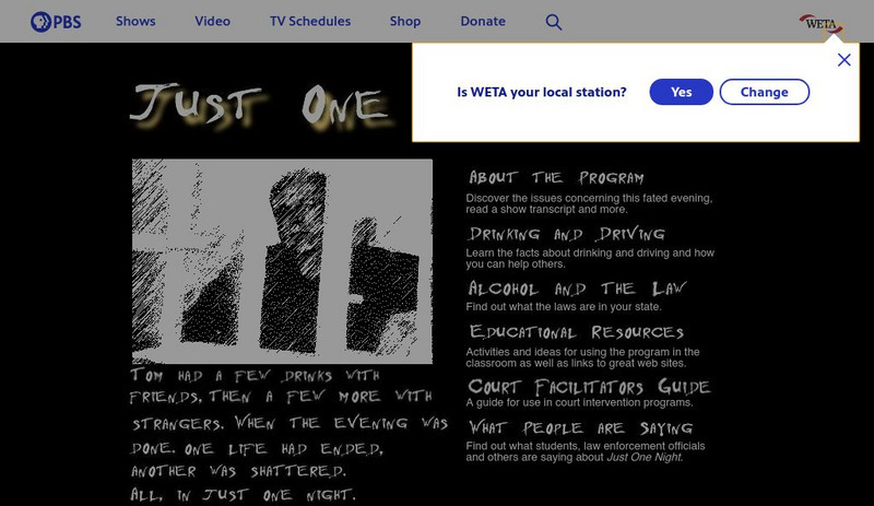 This website accompanies the New Hampshire Public Televsion production "Just One Night," a video portraying a real-life story of drinking and driving and the tragic aftermath. Even without the video, this is a valuble resource. Find an...