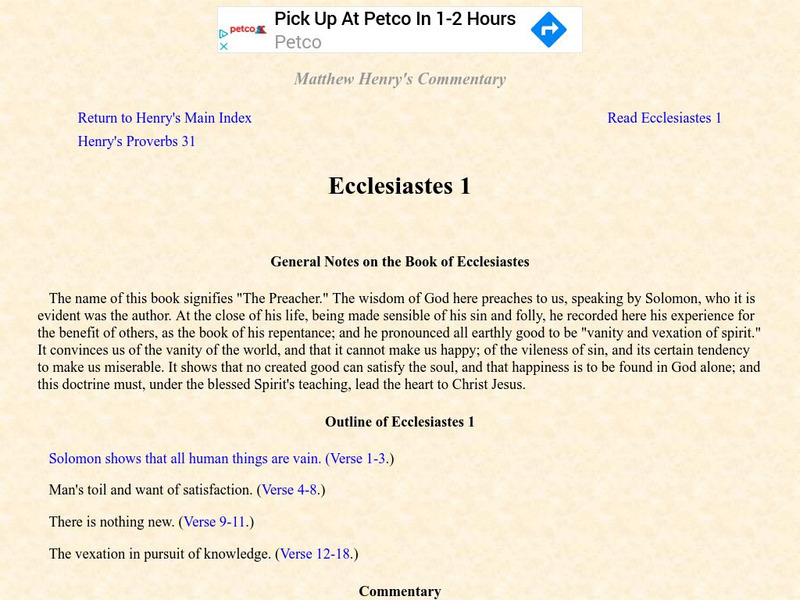 This site is a discussion by Matthew Henry on the book of Ecclesiastes. It includes the main themes of the book and its religious significance. He then gives a chapter by chapter "commentary" on the book.