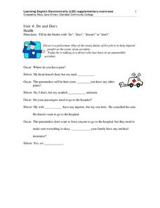 In this do and does ELL worksheet, learners learn the correct usage for the words do and does by reading the conversation and filling in the blanks with do, does, doesn't, or don't.