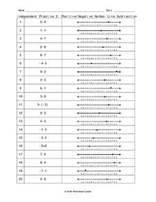 Mathematicians solve and complete 20 different problems that include various number lines. They subtract each given equation using the number line illustrated on the sheet. Then, pupils determine whether the answer is a negative or...