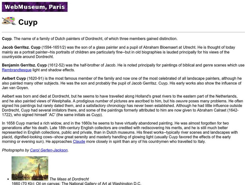 The WebMuseum profiles the careers of three members of a Dutch family of painters: Jacob Gerritsz Cuyp, Benjamin Gerritsz Cuyp, and Aelbert Cuyp.