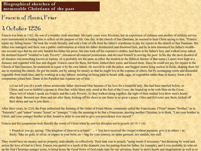 Biographical information about St. Francis of Assisi. Includes a quote from Dante's "Paradiso," in which Aquinas profiles Francis' life.