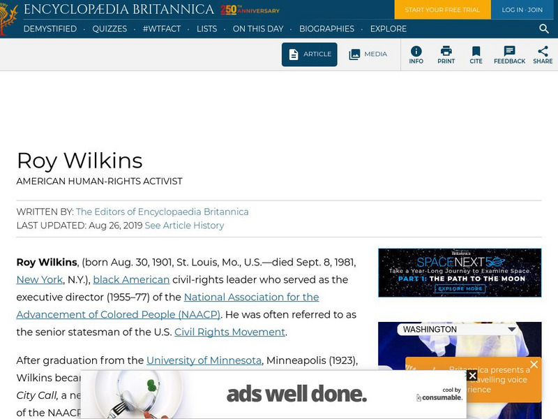 This encyclopedia entry recounts briefly the life of Roy Wilkins, a very influential civil rights leader.