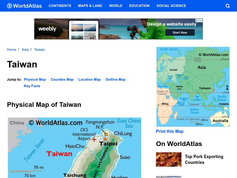 A comprehensive website on Taiwan. Includes colored maps, geographic information, and articles. Click on any tab above the maps to find much more information on topics such as famous Taiwanese, flags, symbols, travel, weather, and lots...