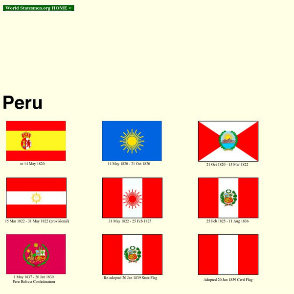 This site is a complete encyclopedia of Peruvian leaders, beginning with the arrival of the Spanish conquistadors. Also provides detailed chronologies, flags, national anthems, maps and indexes.