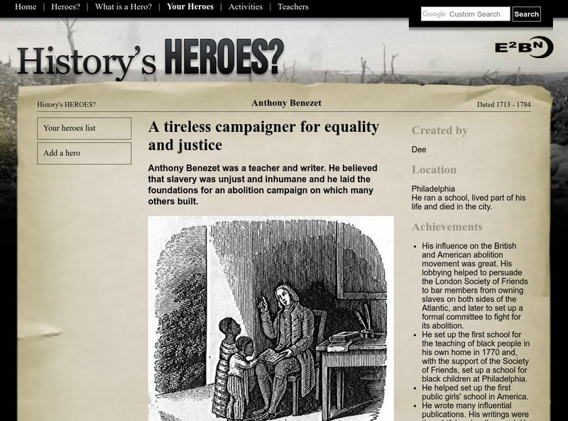 This website explores the lives of people who made their mark on history. Features illustrated story on Anthony Benezet. Find out who he was, what he did, his achievements, and his legacy.