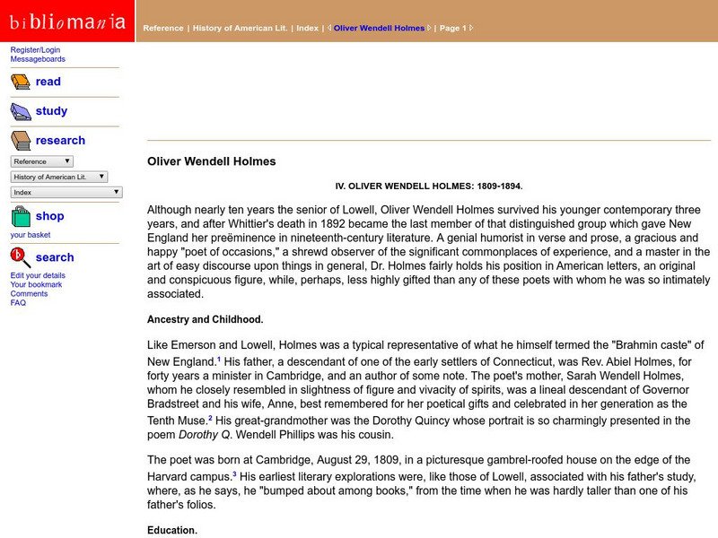Ths Bibliomania site provides a biography of the 19th century American poet Oliver Wendell Holmes (1809-1894). Discusses his ancestry, childhood, education, and career in medicine and literature. Includes analyses of his works and a...