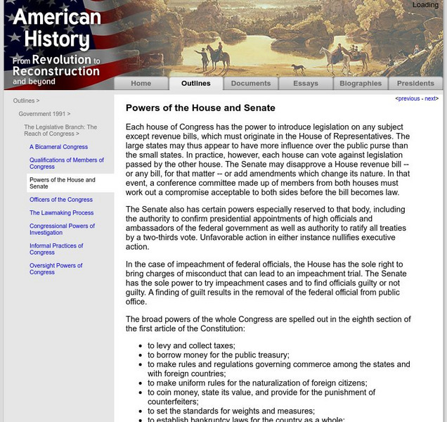 This well-written and well-organized site from The Legislative Branch provides a thorough overview of congressional powers, inherent checks and balances, as well as links to related information.