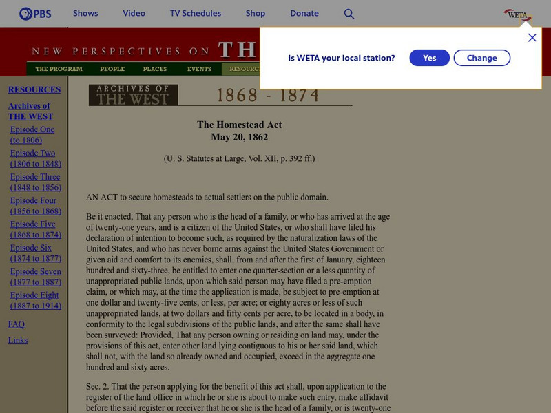 The critically acclaimed PBS series, "The West," provides the text of the Homestead Act of 1862.
