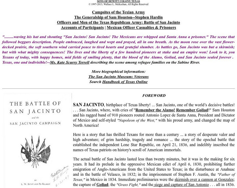 Extensive website from the Sons of Dewitt Colony Texas provides first hand accounts of the Battle of San Jacinto, and the eventual surrender of Santa Anna. Site complimented by battlefield map and the reports of the opposing commanders.