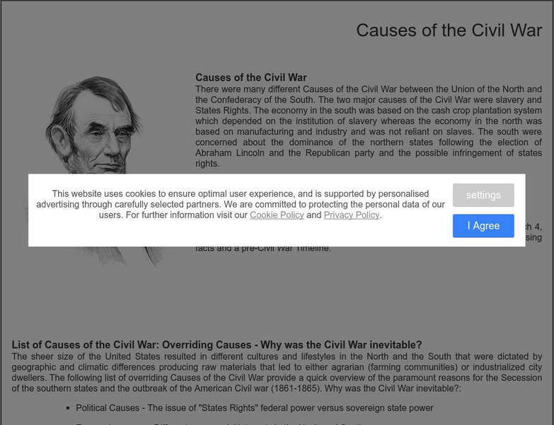 Presents a list of 38 causes of the Civil War. This is broken up into timelines for 1793-1846 and 1846-1861, with some links to more information. Includes a 3-minute video about the life of Abraham Lincoln.