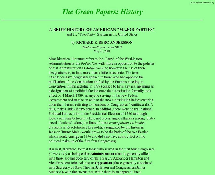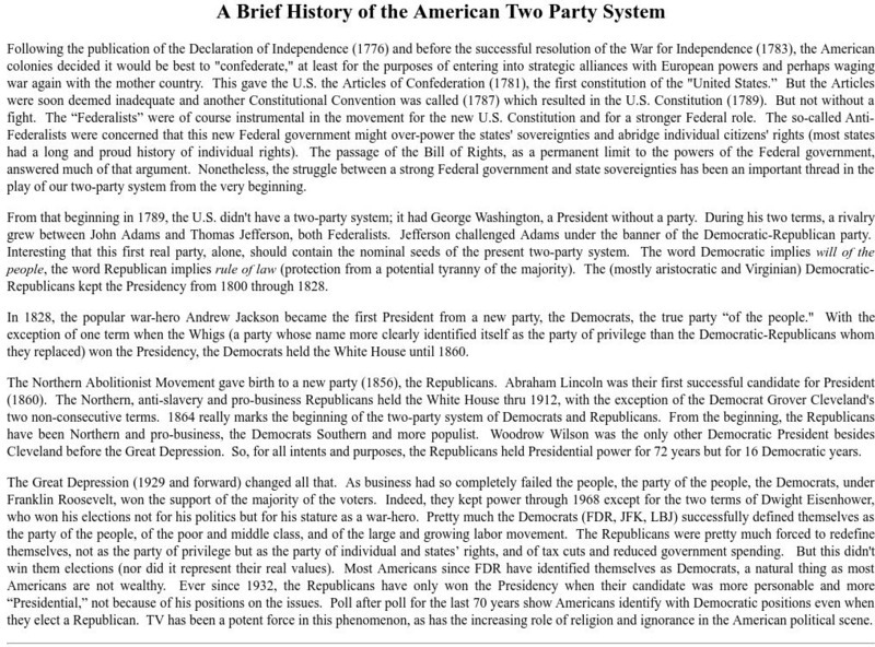 Outline of the party system in the U.S. Describes the history and organization of the two party system and how it has been inlfuenced by third party and independent candidates.
