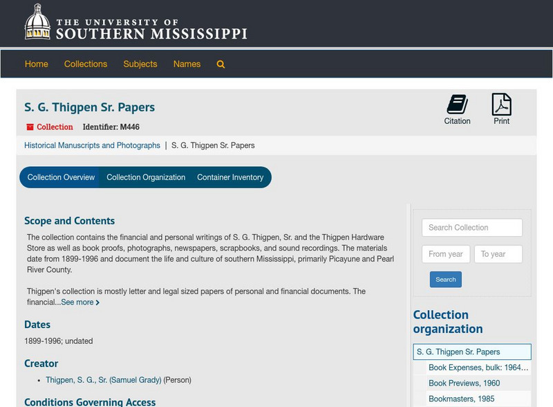 The S. G. Thigpen Sr. Papers digital collection contains a selection of materials from the S. G. Thigpen Papers located at The University of Southern Mississippi. Thigpen was an entrepreneur, historian, and writer who operated from his...