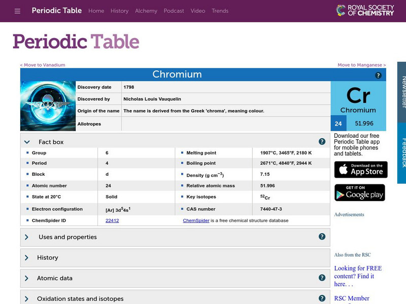 A very well organized set of data tables from Chemicool listing a great deal of information about the physical and chemical properties of chromium.