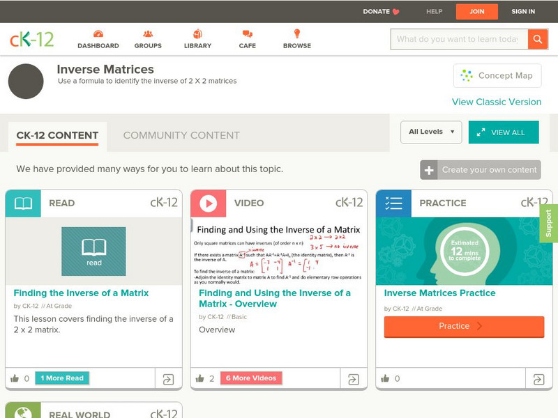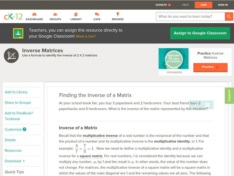 [Free Registration/Login may be required to access all resource tools.] This lesson covers finding the inverse of a 2 x 2 matrix. Students can look at guided notes and then attempt practice problems.