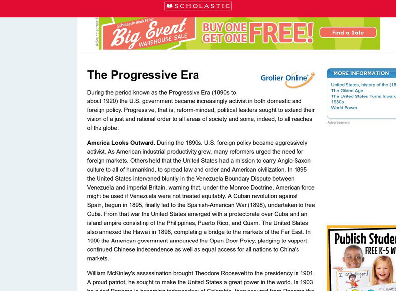 This Grolier On-line Encyclopedia article hits the main points of the Progressive Era stretching from the 1890s until just after the end of World War I.