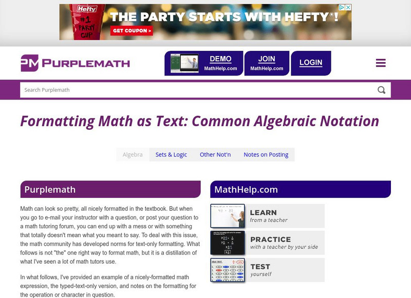 Purplemath: Formatting Math as Text: Common Algebraic Notation