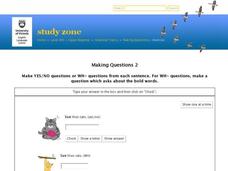 In this forming sentences worksheet, students practice reading 6 statements and turning them into questions. Statements/sentences advance in difficulty.