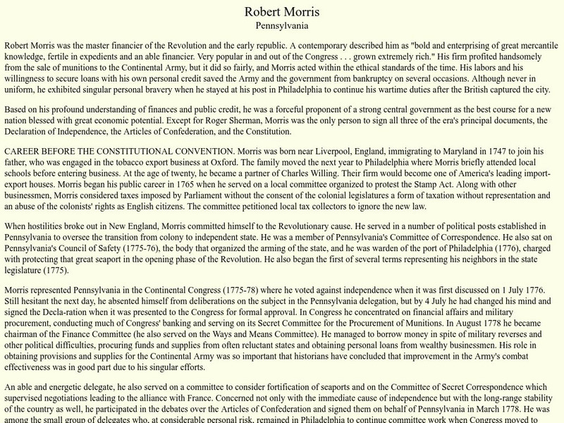 A nice biographical outline on the life of Gouverneur Morris, a delegate to the Constitutional Convention from Pennsylvania. He served in the Revolution and later was an ambassador to France during the "Reign of Terror."