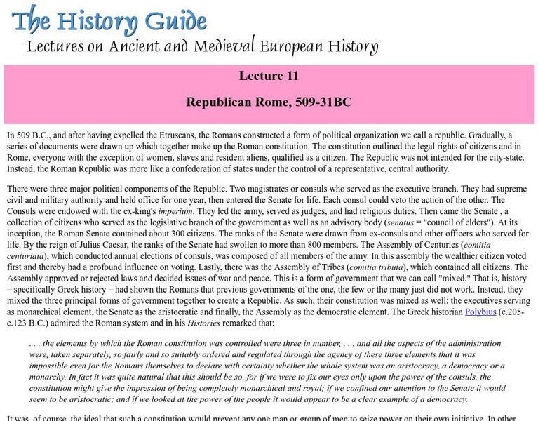 A detailed lesson plan designed to teach young scholars about the republican form of government established by the Romans in their early history and also how it relates to American government today.