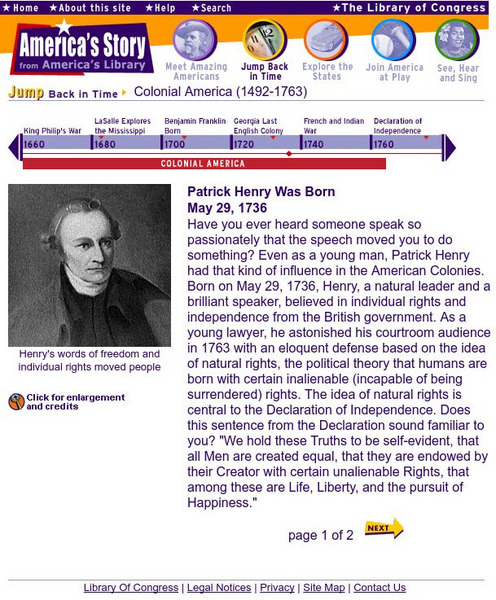This site explores Patrick Henry's passionate role as "Orator of Liberty," leading up to the American Revolution. Here you can find audio clips, pictures, and eyewitness accounts of Henry.