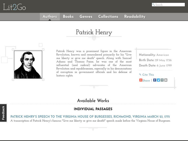This site provides a biography of Patrick Henry, highlighting his public speaking abilities and famous speeches.