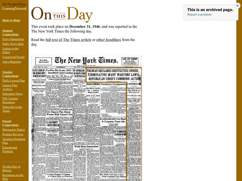 New York Times article from 1946 reports the end of wartime laws and hostilities; references to the Smith-Connally Act and its effects included.