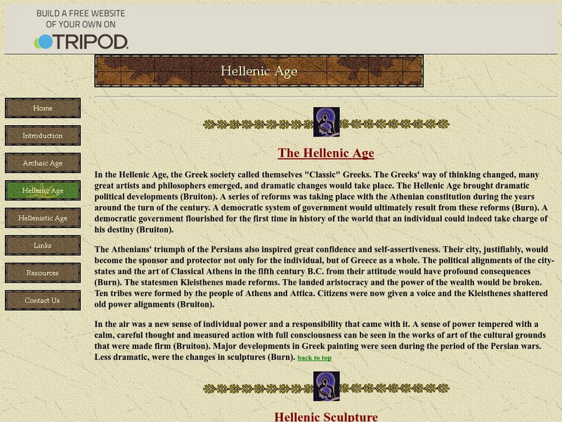 Describes the main features of the Hellenic Age in ancient Greece, and examines Hellenic sculpture and the different styles and influences.