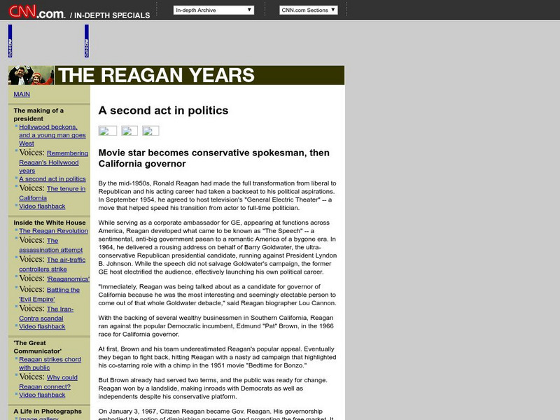 Part of a cnn.com in-depth special "The Reagan years", this site follows Reagan's evolution from Hollywood movie star to governor of California.