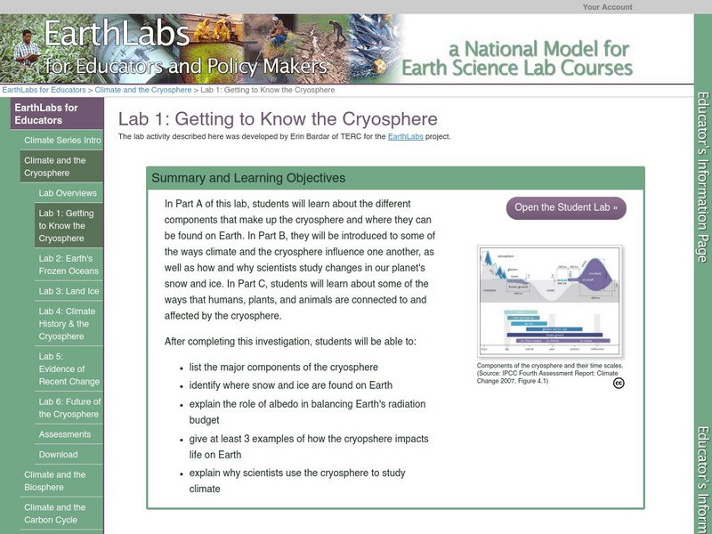 A lab experiment (in a series of experiments) that explores the cryosphere. In this lab, students will be introduced to the different parts of the cryosphere and their locations. They will also be shown the connections between the...