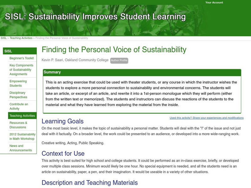 Students explore a more personal connection to sustainability and environmental concerns by reading an article, and rewriting it into a first-person monologue which they will perform.