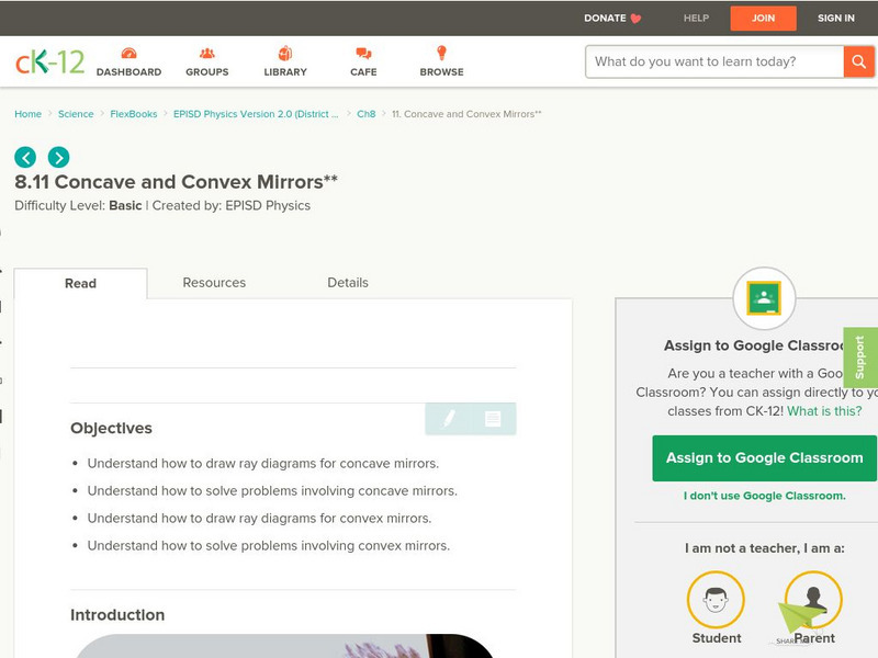[Free Registration/Login may be required to access all resource tools.] In this lesson, students learn how to draw ray diagrams and to solve problems for concave and convex mirrors.