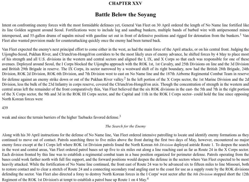 Provides a detailed description of the battle below the Soyang. Includes information on the search for the enemy, the offensive resumed, and the battle shifts east.