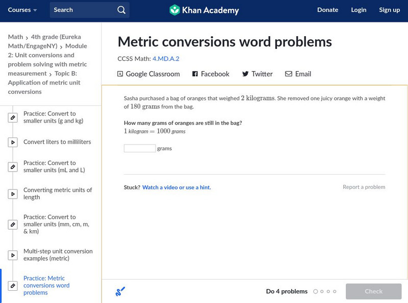 Practice metric length, volume, and mass problems that require expressing measurements given in a larger unit in terms of a smaller unit. Students receive immediate feedback and have the opportunity to try questions repeatedly, watch a...