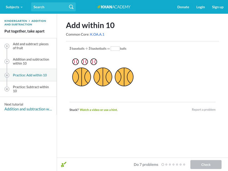 Practice adding by "putting together" (with numbers less than 10). Students receive immediate feedback and have the opportunity to try questions repeatedly, watch a video or receive hints.