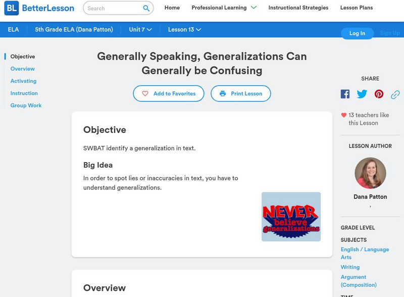 In this lesson, 5th graders learn how to identify a generalization in a text so that they can then spot lies or inaccuracies. Includes downloadable workbook with a generalization activity on page 53.