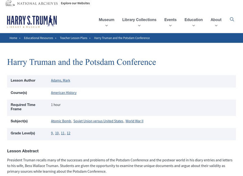 This activity allows students to see President Truman's perspective at the Potsdam Conference in 1945. Features include overview and firsthand accounts of conference, questions, vocabulary, and photos.