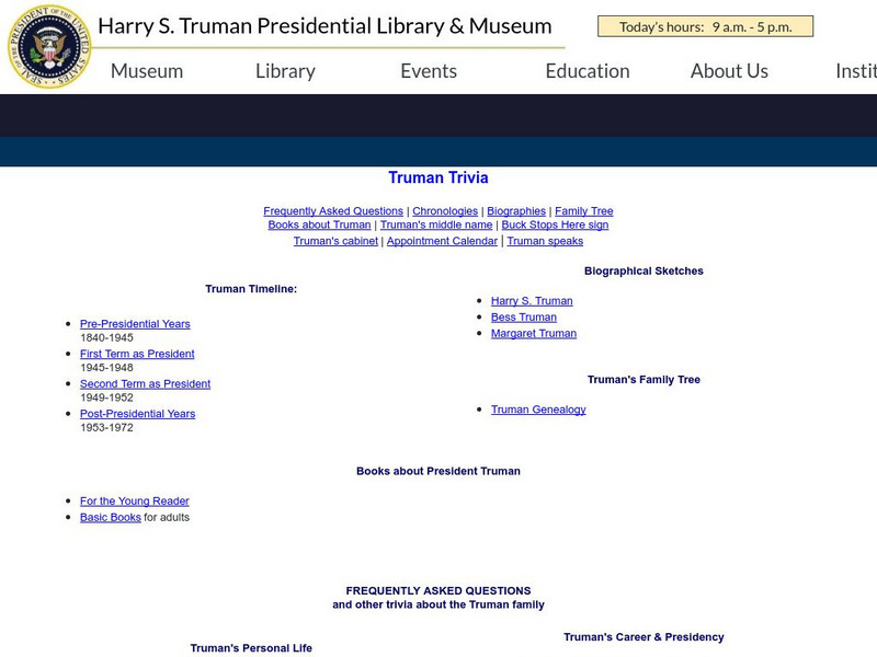 This has many pages of information about Harry Truman. A timeline, family tree, biography, and book list are all included.