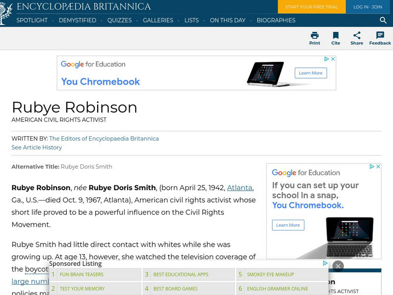 This entry from Encyclopedia Brittanica's Guide to Black History features Rubye Robinson, an American civil rights activist whose short life proved to be a powerful influence on the Civil Rights Movement. This site, rich in detail and...