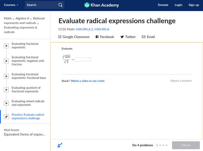 Evaluate numerical radical expressions using the properties of exponents. Students receive immediate feedback and have the opportunity to try questions repeatedly, watch a video or receive hints.