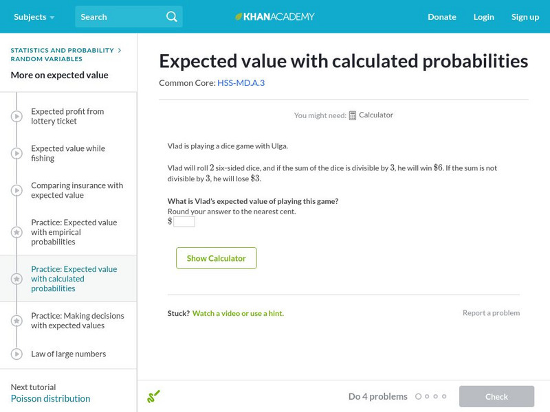 Find expected value based on calculated probabilities. Students receive immediate feedback and have the opportunity to try questions repeatedly, watch a video or receive hints.
