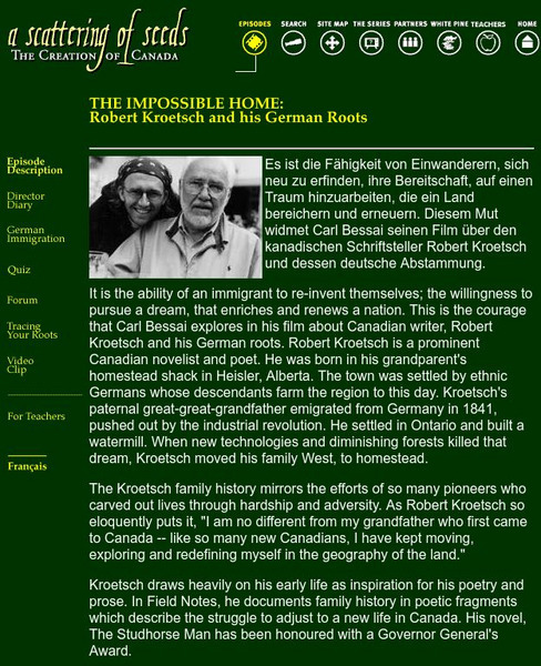 This site describes the family history of Robert Kroetsch, a Canadian writer and poet, whose family emigrated from Germany in 1841. It provided background for the making of a television documentary on Kroetsch's family.
