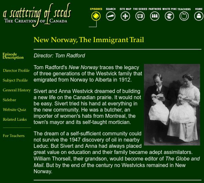 This site describes the making of a television documentary about a family of Norwegians who emigrated to Manitoba, Canada in 1912. The stories of the immigrants, the obstacles they faced and the legacy they have left are described here.