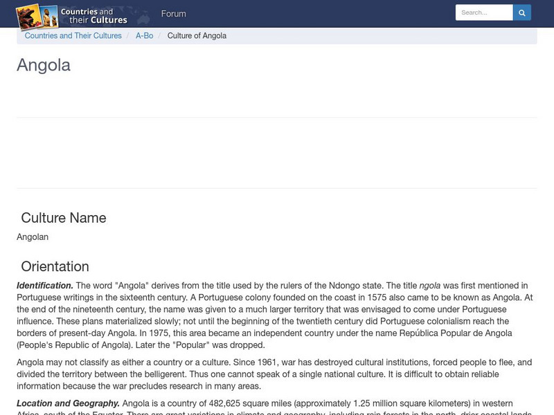 Provides an overview of the culture of Angola. Gives basic information on topics such as geography, ethnic makeup, languages, symbolism, economy, food, customs, social stratification, family life, education, religion, politics, etc....