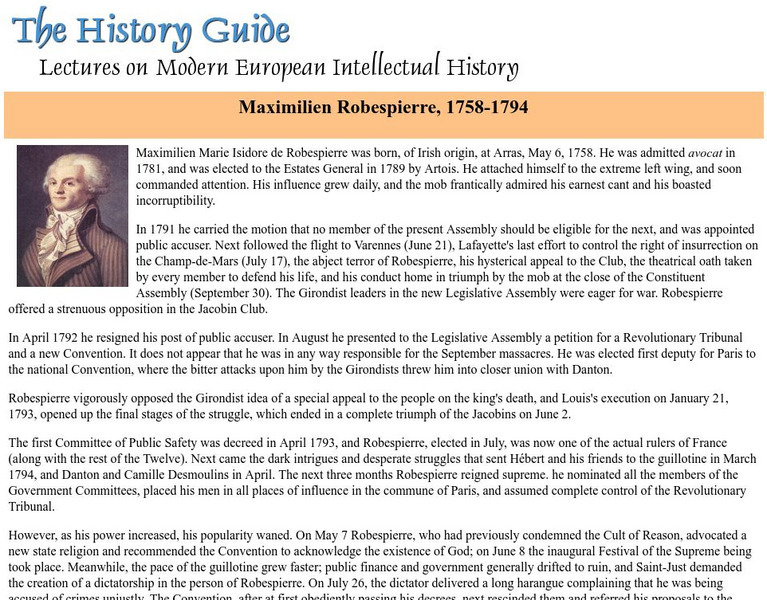 Maximilien Robespierre (1758-1794) was an integral part of the French Revolution, specifically the Reign of Terror. This website provides a biography of Robespierre.