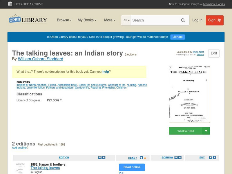This ebook version of William Osborn Stoddard's The Talking Leaves: An Indian Story has been made available in multiple formats by the Open Library. Editions of the full novel, organized by year of publication, may be accessed here.