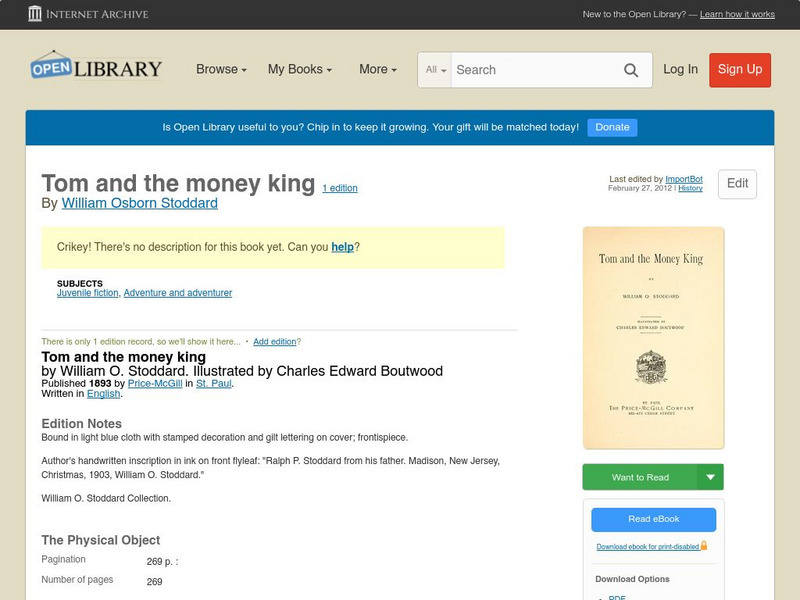 This ebook version of William Osborn Stoddard's Tom And The Money King has been made available in multiple formats by the Open Library. Editions of the full novel, organized by year of publication, may be accessed here.