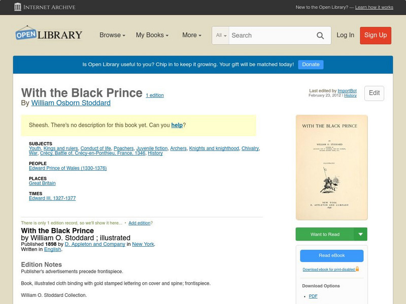 A scanned copy of the 1898 publication of With the Black Prince by William Osborn Stoddard, a fiction book for children.